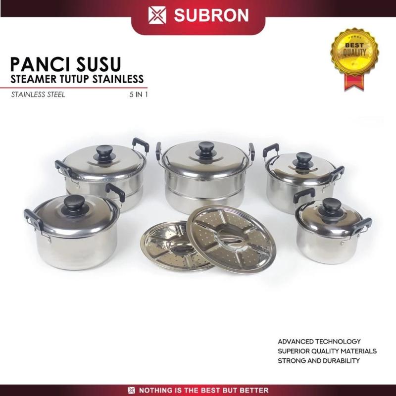 SUBRON PANCI 5IN1- Produk ini terbuat dari stainless steel, dijual per set- 1 set isi 5 panci dan 2 saringan. - Bisa untuk kompor induksi, kompor listrik dan kompor gas.Ukuran panci:- Diameter 16...