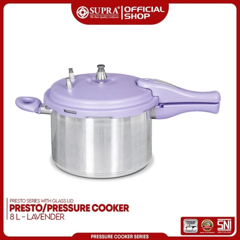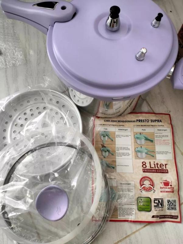 Supra Panci Presto Pastel 8 Liter dari Supra dengan variari warna LavenderPanci Presto atau Pressure Cooker yang terbuat dari bahan alumunium dengan ketebalan 3.2 mm. Dilengkapi dengan handle yang dib...