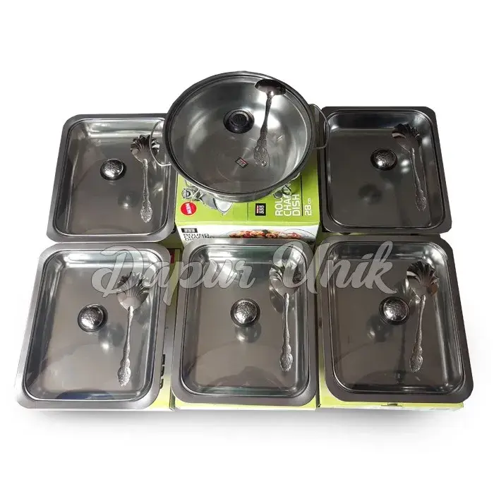 Wadah Prasmanan 5 Kotak + 1 Bulat Stainless Steel - Set prasmanan lengkap dengan tutup kaca- Termasuk kotak, sendok, dan tungku- Kualitas bahan tebal dan terbaik- Keamanan pengiriman dengan bubbl...